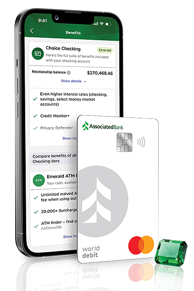 You must meet and maintain enhanced Choice Checking benefit tier qualifications for Platinum Choice, Emerald Choice or Emerald Private Choice, listed on the Associated Choice Checking Product Disclosure, to obtain enhanced rates on Associated Choice Checking, Associated Relationship Savings, and Select Money Market accounts. For current rates, refer to an Associated Bank Deposit Account Rates Sheet or ask a banker for more information. (1415)